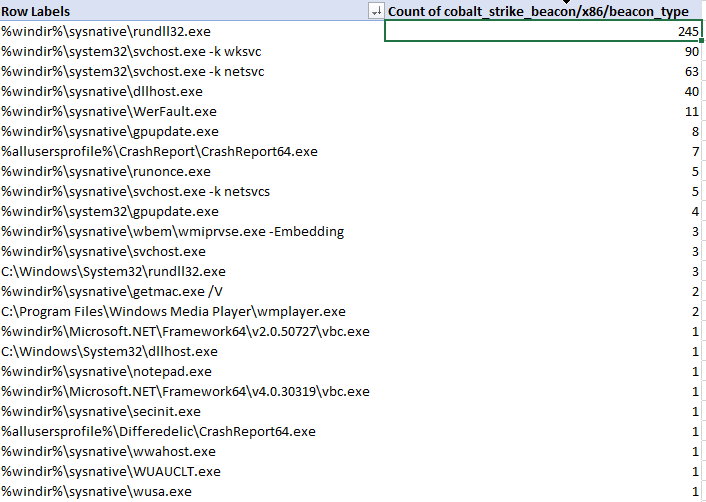 As we can see, the most common choice by far was rundll32.exe, followed by svchost.exe, dllhost.exe, WerFault.exe and gpuupdate.exe – but there are definitely some less-observed binaries in the table. I would urge defenders to ensure you are considering all possible hunting options when looking for C2 traffic in your network.
