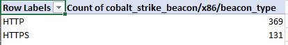 One of the most obvious things we can look at first is understanding the type of beacons that threat actors are using – Cobalt Strike supports a variety of types including HTTP, HTTPS and DNS – threat actors today typically use HTTPS, as evidenced in the below analysis (with DNS being exceedingly rare due to how slow they are to interact with).