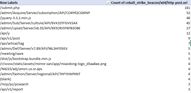 When threat actors are setting up an HTTP-based beacon, they must configure different properties such as the URIs that will be invoked, the user agent, the HTTP verbs, etc – so let’s take a look at these – starting with the most common POST URIs setup by actors.