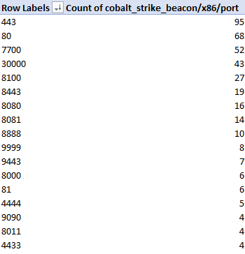 In terms of TCP Ports, we observe beacons communicating on a wide variety of outbound connections. In my experience doing Incident Response, C2 traffic tends to stick to port 80 or 443 but this is evidence that this is not always the case!