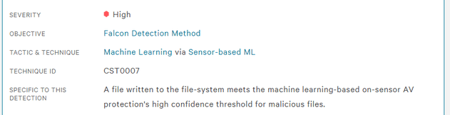 This in turn generated a .CPL file for us which was deployed onto the victim and executed to achieve the shell – keep in mind this is only bypassing the prevention policy – this is still likely to generate a Medium to High severity alert with respect to their Machine Learning algorithms and heuristics detecting a Suspicious File as shown below.